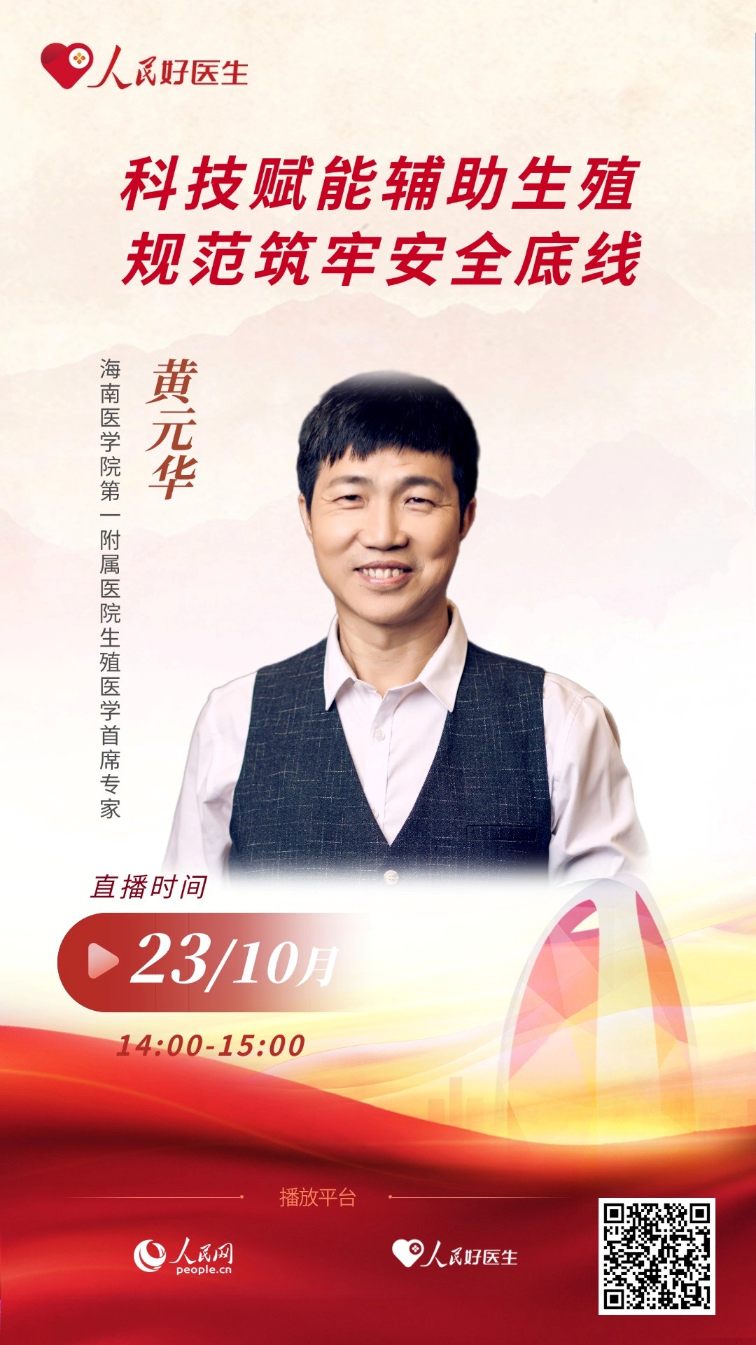 10月23日14:00,海南医学院第一附属医院生殖医学首席专家黄元华将做客人民好医生客户端直播间,从专业角度解析辅助生殖技术的安全规范、风险防控等热点话题。敬请关注。
